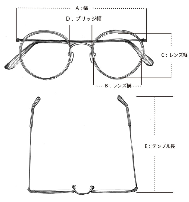 E:テンプル長(耳に掛ける部分の長さ)